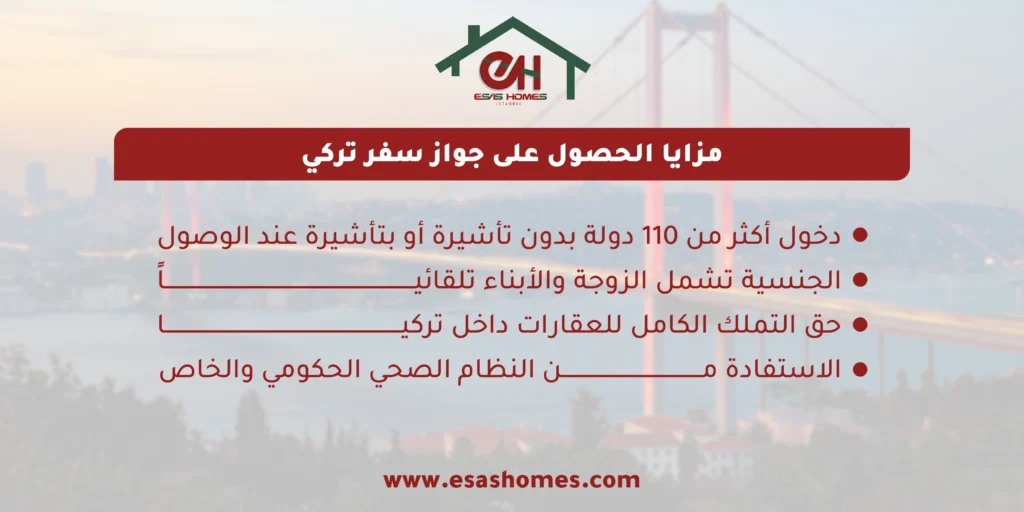 يمنح الجواز التركي لحامله مجموعة كبيرة من المزايا الاستراتيجية التي تجعله خيارًا مثاليًا للمستثمرين والعائلات، ومن أبرزها: