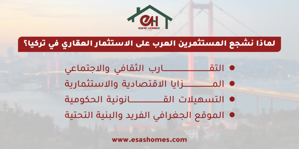 إن تشجيع المستثمرين العرب على الاستثمار العقاري في تركيا يرتكز على مزيج فريد من العوامل الاقتصادية، والقانونية، والثقافية. مما يجعلها وجهة مثالية لهم على وجه الخصوص: